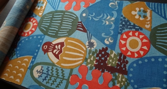 紬生地に何とも可愛らしい文様の型絵が施されています。卵から孵った雛に、遠山に、木々に等々。これはなんだろう?と ひとつひとつを じ~っと 眺めていたくなります。