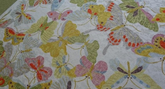 それは、これだけの蝶尽くしになるとどんなに良い染めを施しても、やりっぱなしだとやはりうるさくなってしまいます。しかし柄合わせがきちんと合うように計算された配置にすると柄だけではなくデザインとなり、見る者を惹きつける素敵さに変わります。
